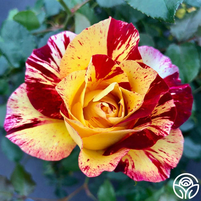 Named for the Danish-French impressionist painter, Camille Pissarro is a stunning Floribunda that stands out with variegated, double blooms in vibrant yellow, red, and just a hint of white. This repeat bloomer features an apple-rose scent and is an excellent cut flower. Camille Pissarro has a compact growing habit, making this rose perfect for borders, beds, or pots. A truly unique rose that is a must have for anyone in zones 6b or higher.