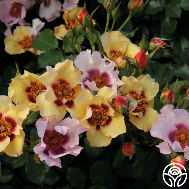 A true, show-stopping variety, In Your Eyes packs a punch with her unique coloring and elegant, growth habit. Starting as a creamy yellow with an intense red center, she will fade to a soft lavender as she ages. Her single blooms come out in clusters for a showy display throughout the season. In Your Eyes is wildly prolific and has strong disease resistance in addition to a mild, fruity fragrance.