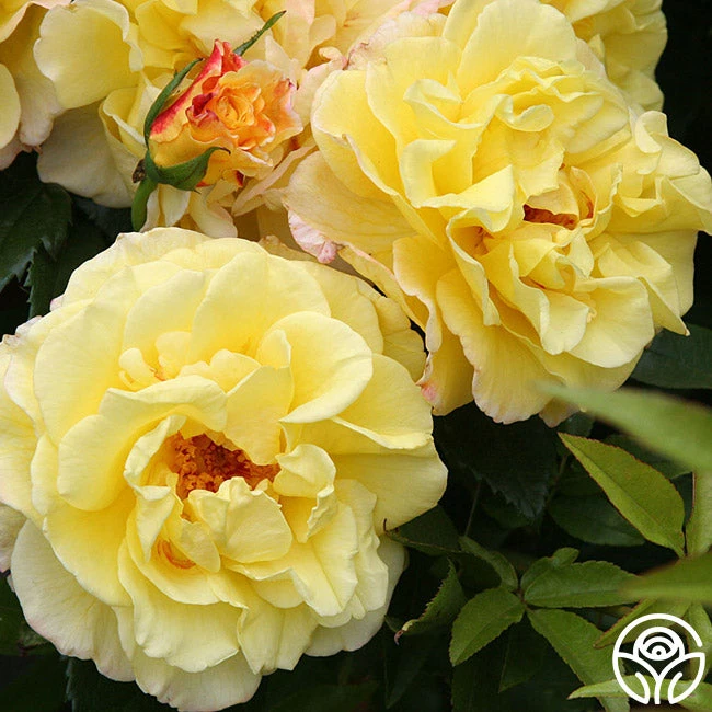 Hardy in zones 5-9, Rugelda is a Rugosa hybrid in the most unusual color. Her double blooms are a clear yellow suffused with pink against shiny, bronzy-green foliage. Her small flowers are produced in clusters and are moderately fragrant.