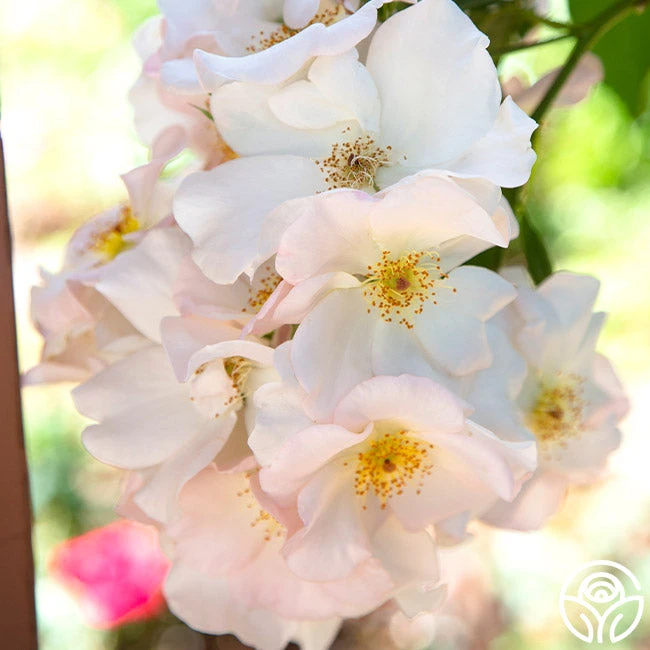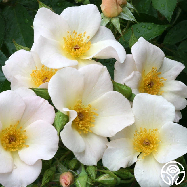 Sally Holmes is a proven winner in outstanding Shrub roses. Her large, tightly packed trusses of rich, ivory-white, 5″ flowers have stunning golden centers. She is a vigorous, continual blooming compact bush pushing out over 60 blooms per truss. Sally Holmes is rated the second highest by the American Rose Society and should be in the gardens of all who love white roses.